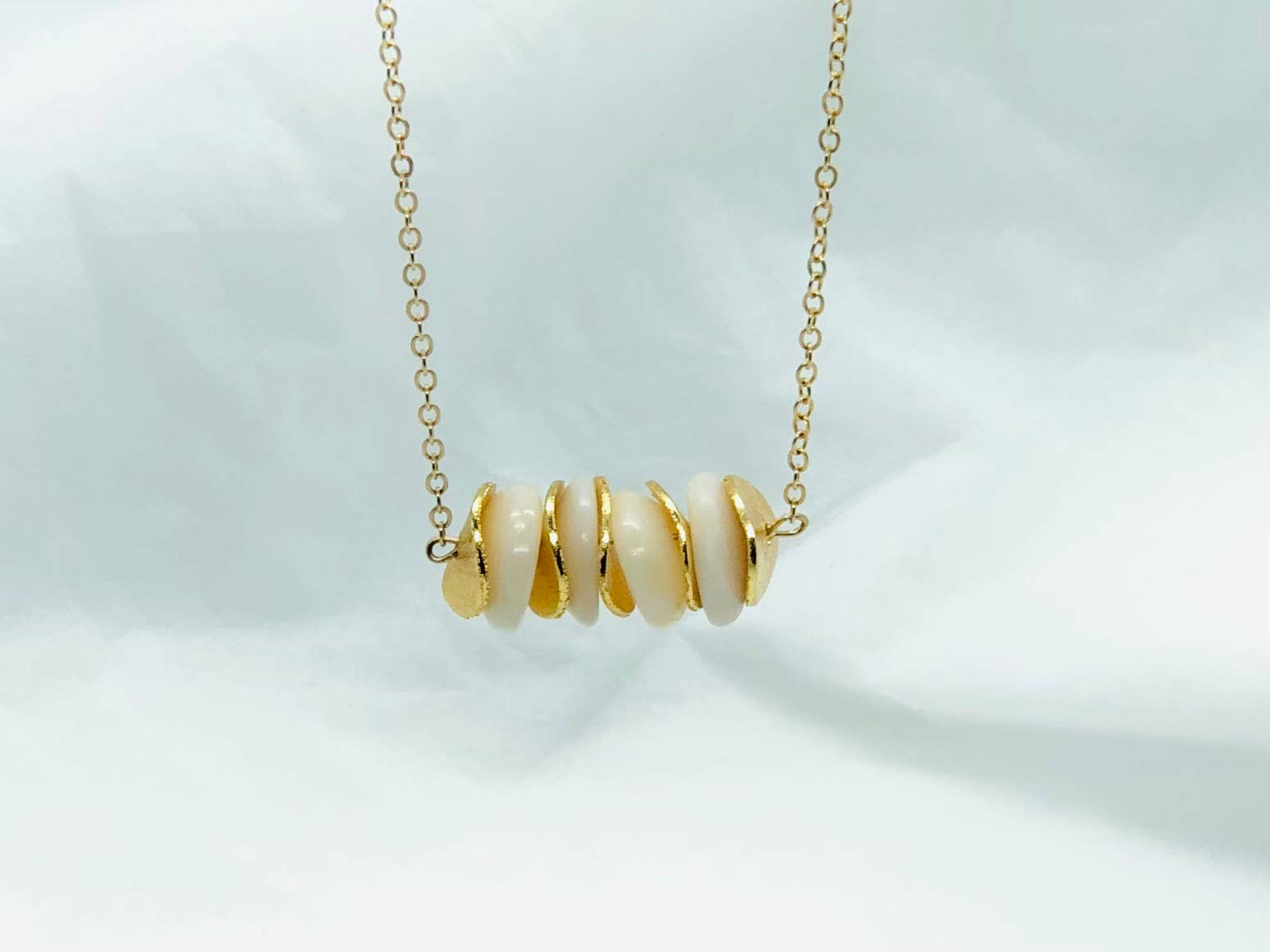 The Hawaiian puka shells are one of many gems from the sea. Each shell is complemented with gold plated roundels and balanced on a hand crafted gold bar made with gold filled wire. The bar is centralize on a 16 inch 14k gold-filled chain necklace. The lever clasp is also 14k gold filled and is quality stamped. A timeless design and great conversation piece. The shells used are naturally sanded and polished by the waves which can take a lifetime. Then the artist sizes, sorts, and even color matches the fine shells. Puka shells can come in many shades and colors. Each necklace is one of a kind and takes countless hours from hunting the shorelines until it’s available for adornment.
