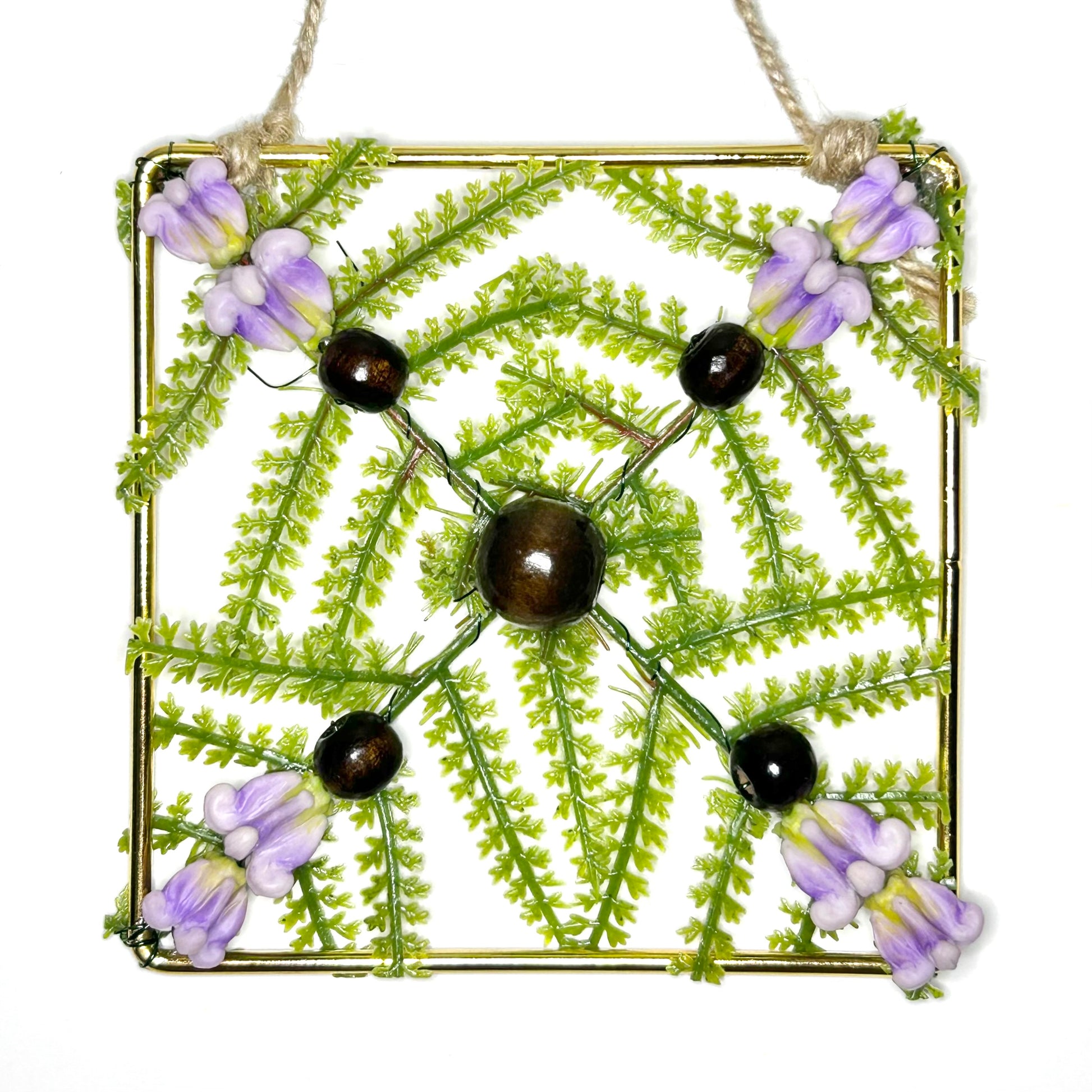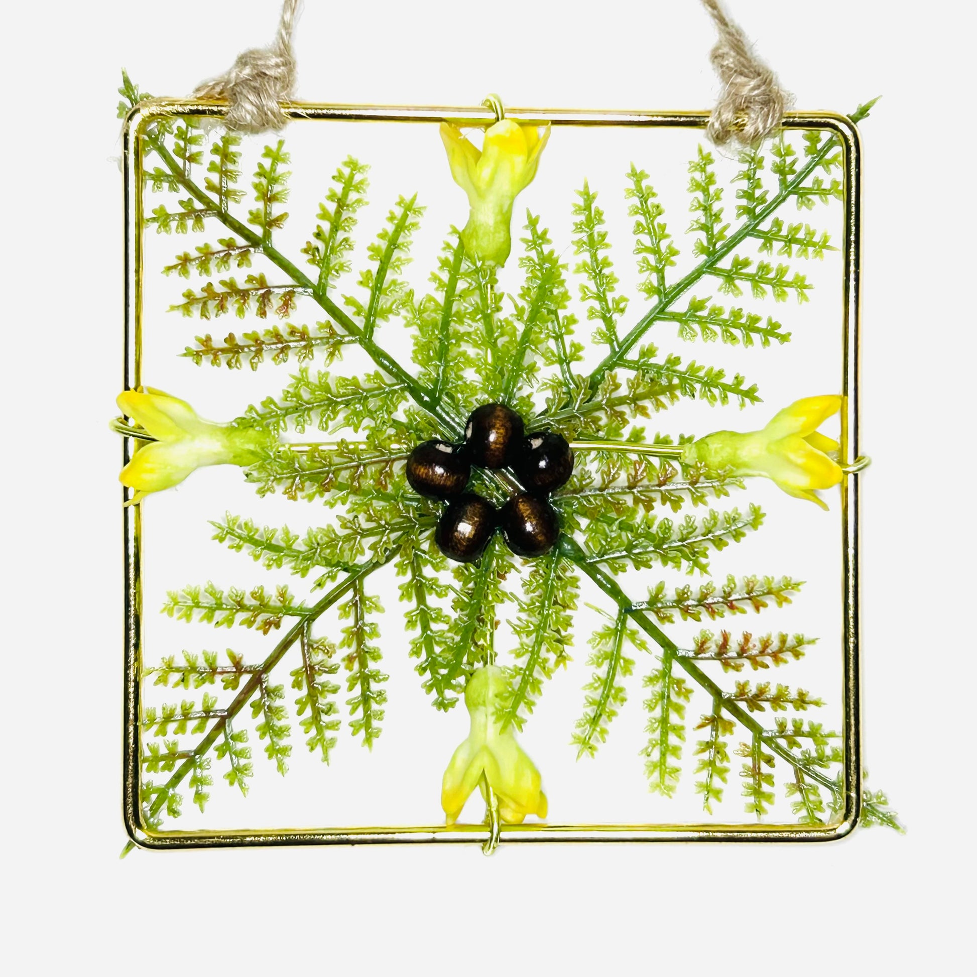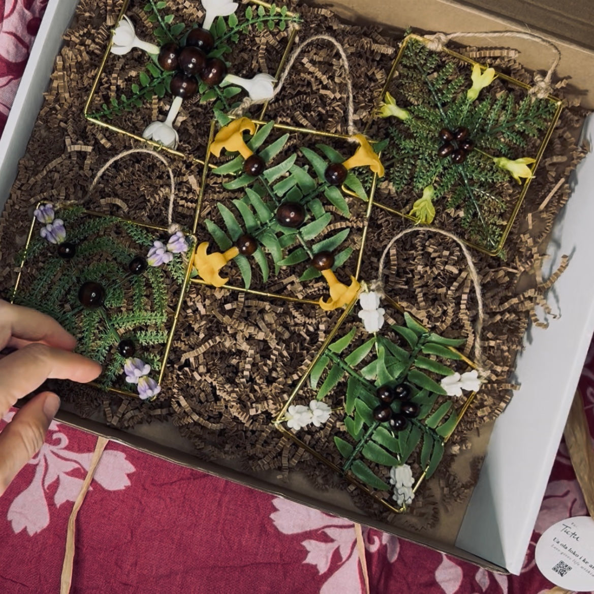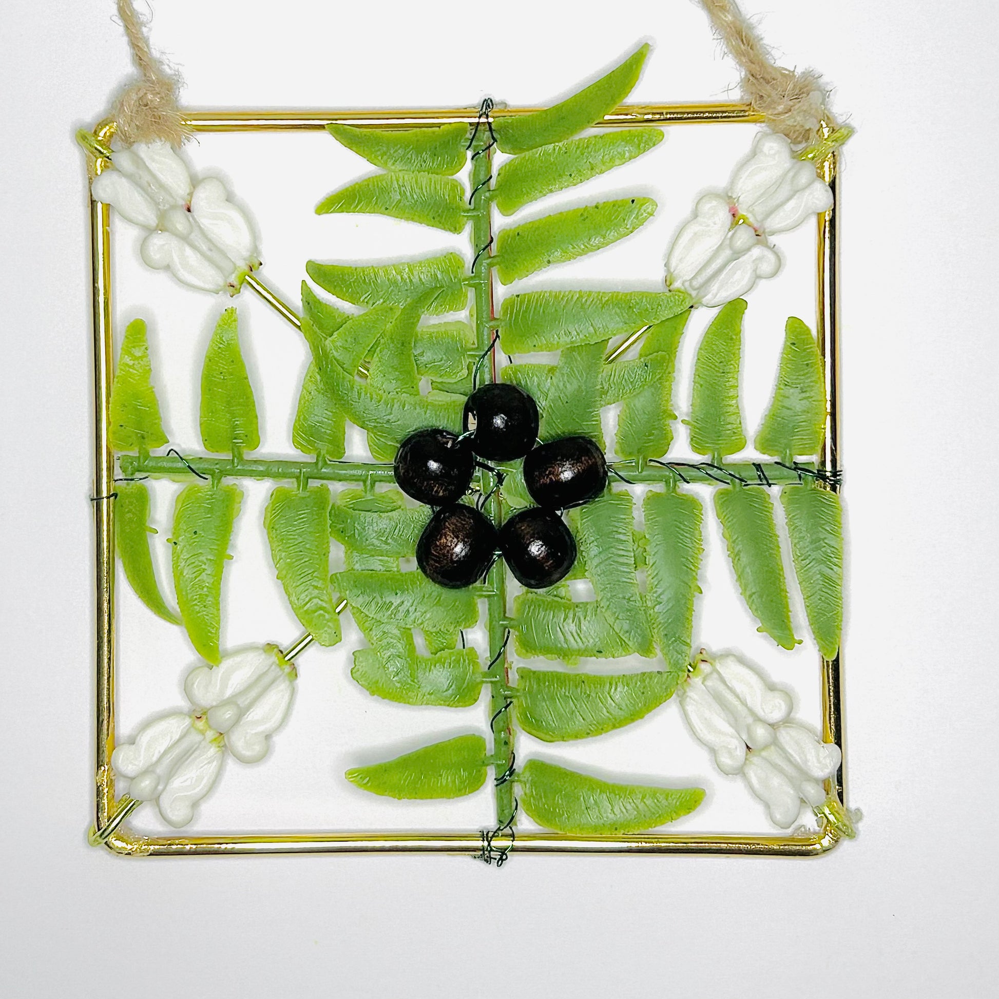 The life like flowers and fern are set on 4 x 4 gold plated metal frames. These ornaments make great gifts for loved ones whom you want to give a Mele Kalikimaka :)
