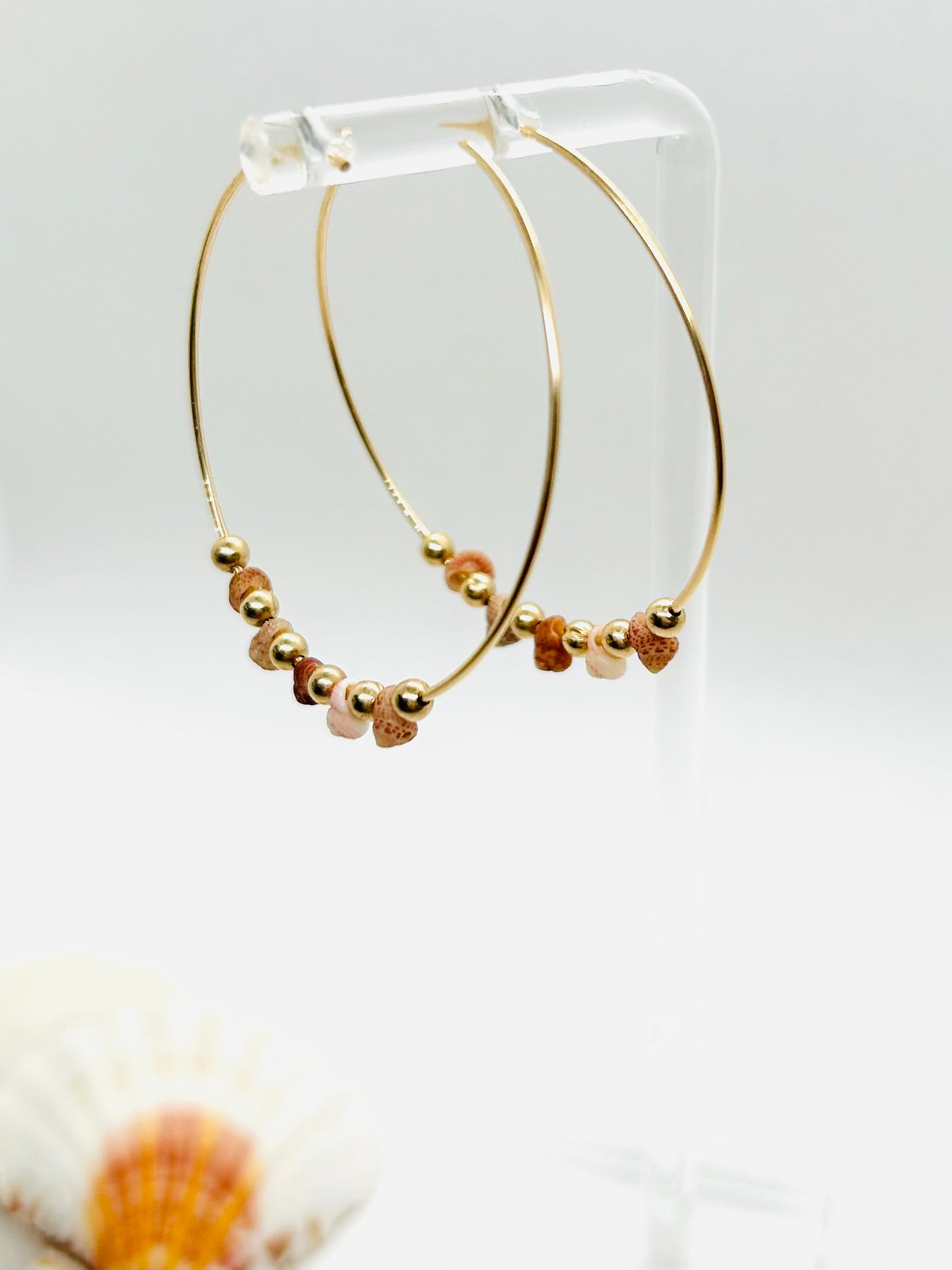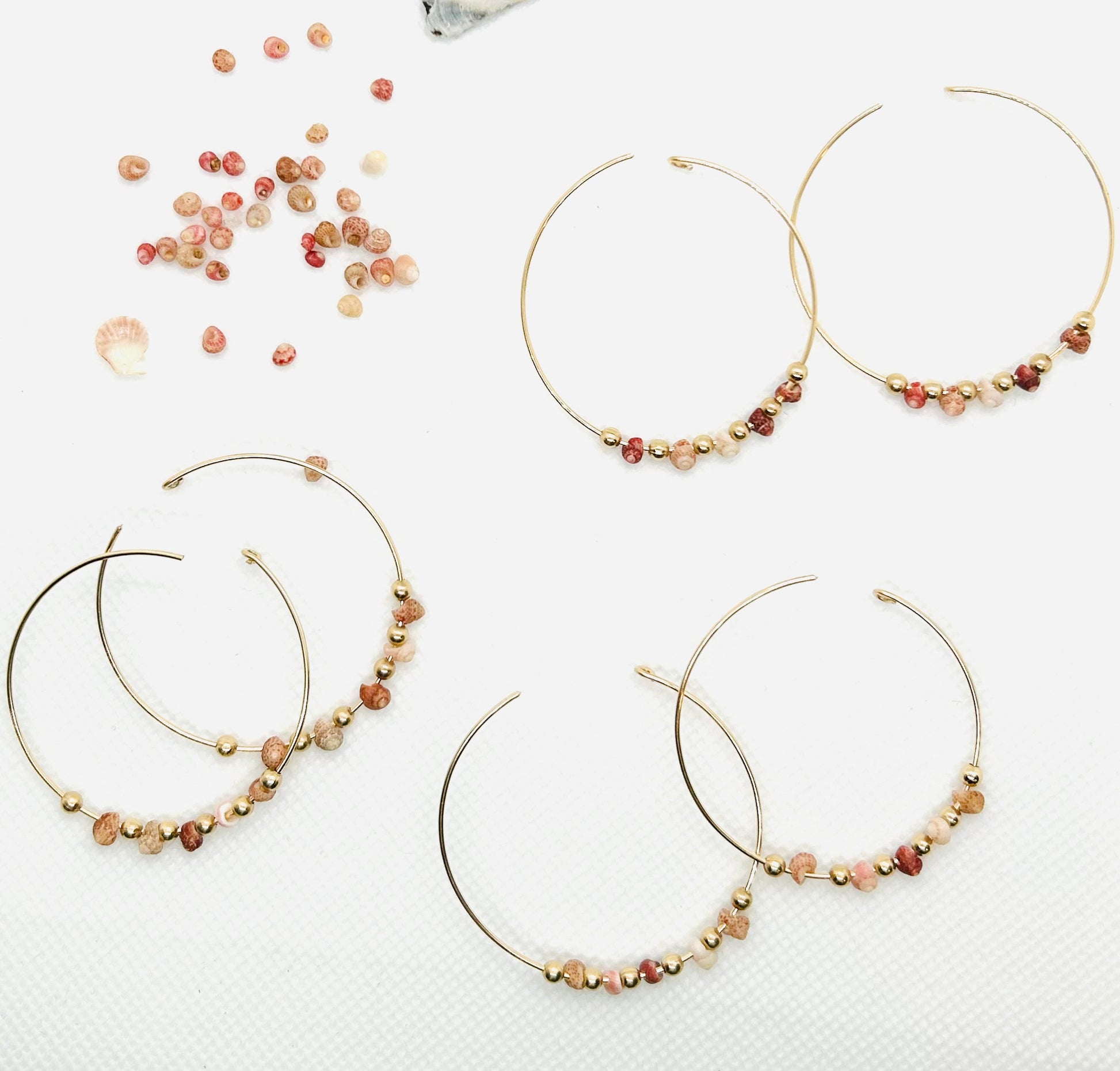 The treasured Kahelelani shells are found on the shorelines of Kaua’i and are a sister to the Niihau shells. 14k gold filled beads and hoops pair with the colorful shells. Each earring set is uniquely different as all shells are. The artist spends hours finding, sorting, cleaning, and piercing each shell. Once 5 matches have been made they are arranged by the artist to contrast each other to enhance the look of each shells uniqueness and its colorful difference. Hoops are a classic, but these gorgeous gold hoop earrings are a heirloom.