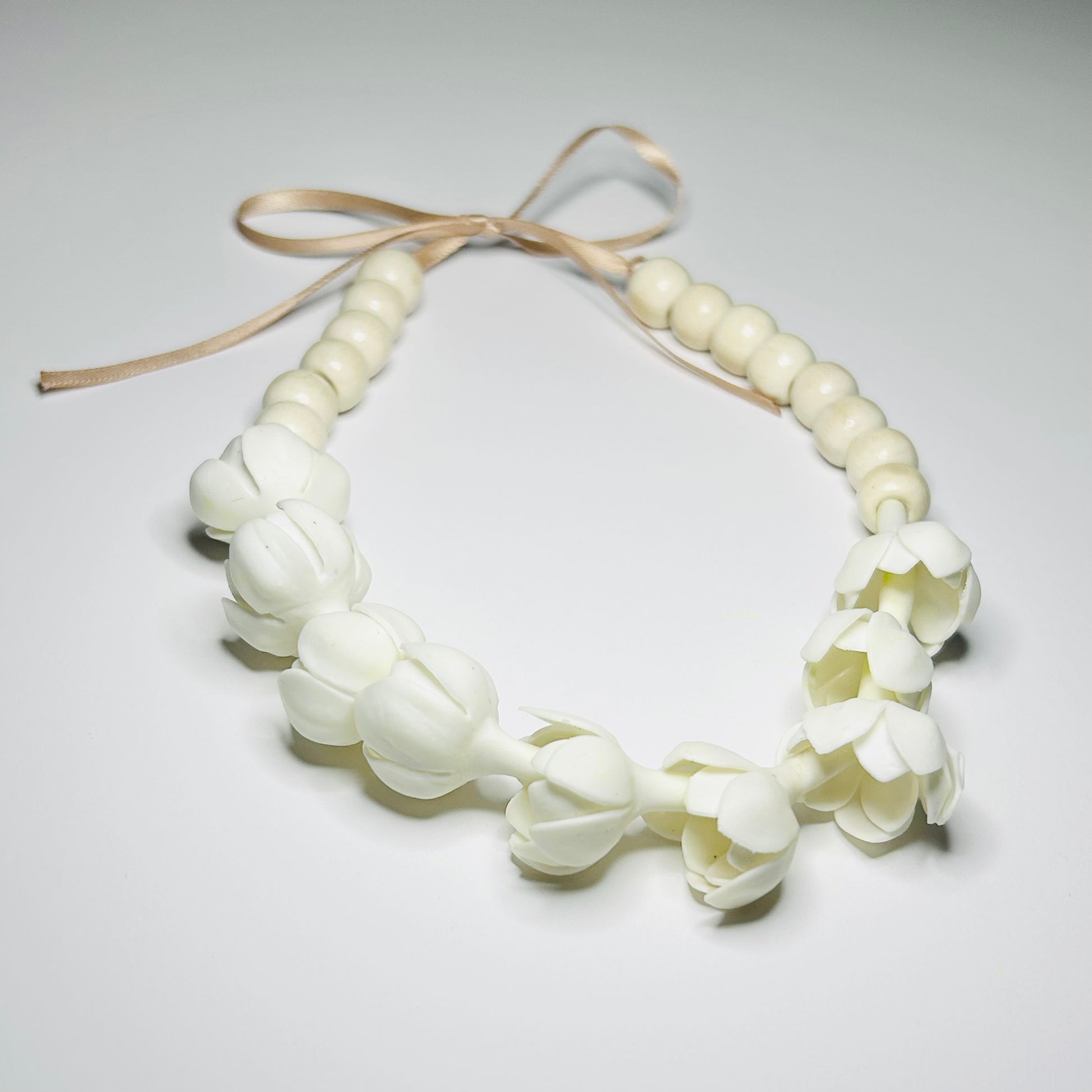 Just blooming Pikake flowers handmade with clay and paired with white wood beads and a pretty natural toned ribbon to tie over your rear view mirror, hang on a door knob with a privacy sign, or dangle on a hook around the house. This lei will bring a feeling of freshness wherever it is hung.