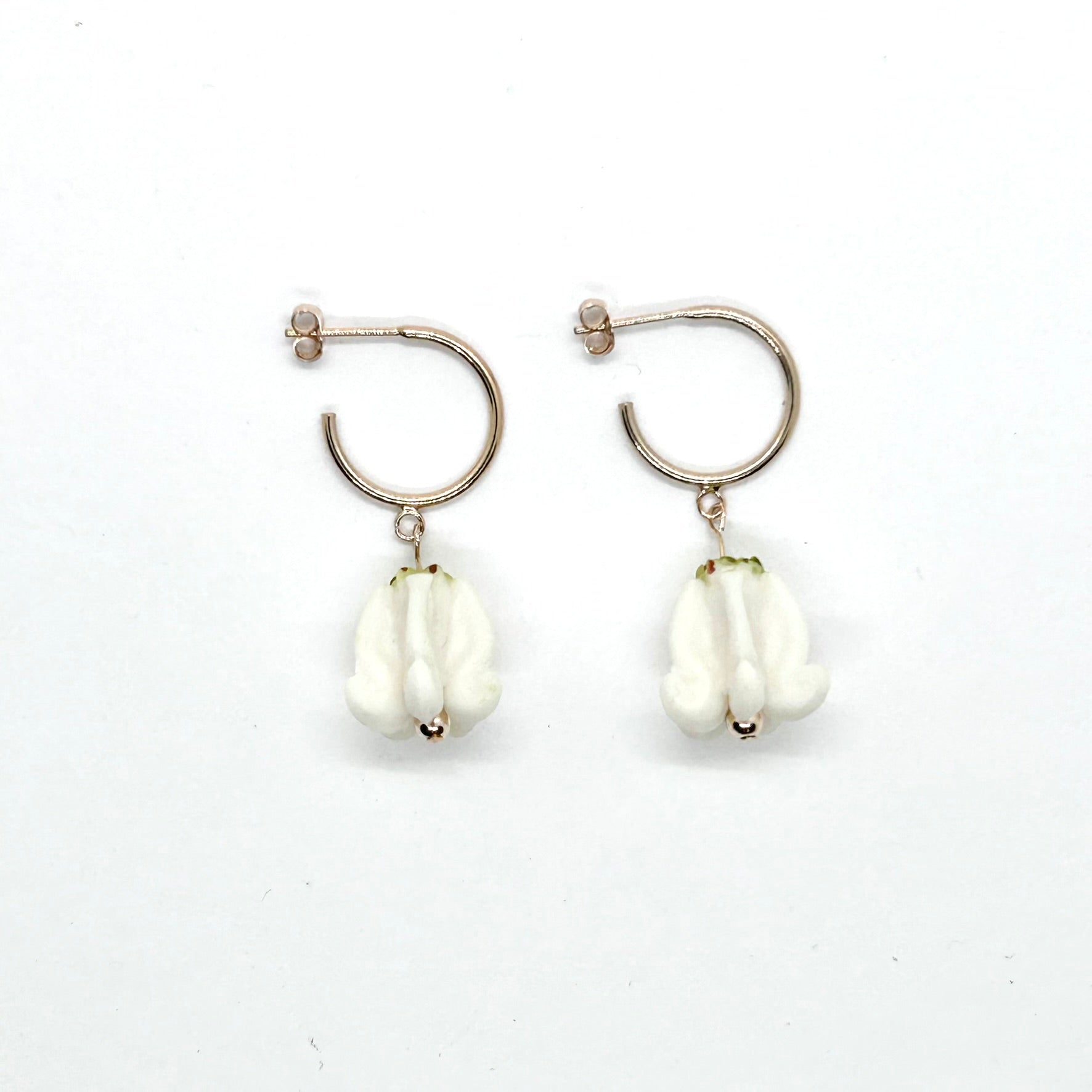 Classy 14k gold filled, three quarter hoop earrings, with 10k snug back. Each of the flowers are handmade with clay. White and Purple variants available.