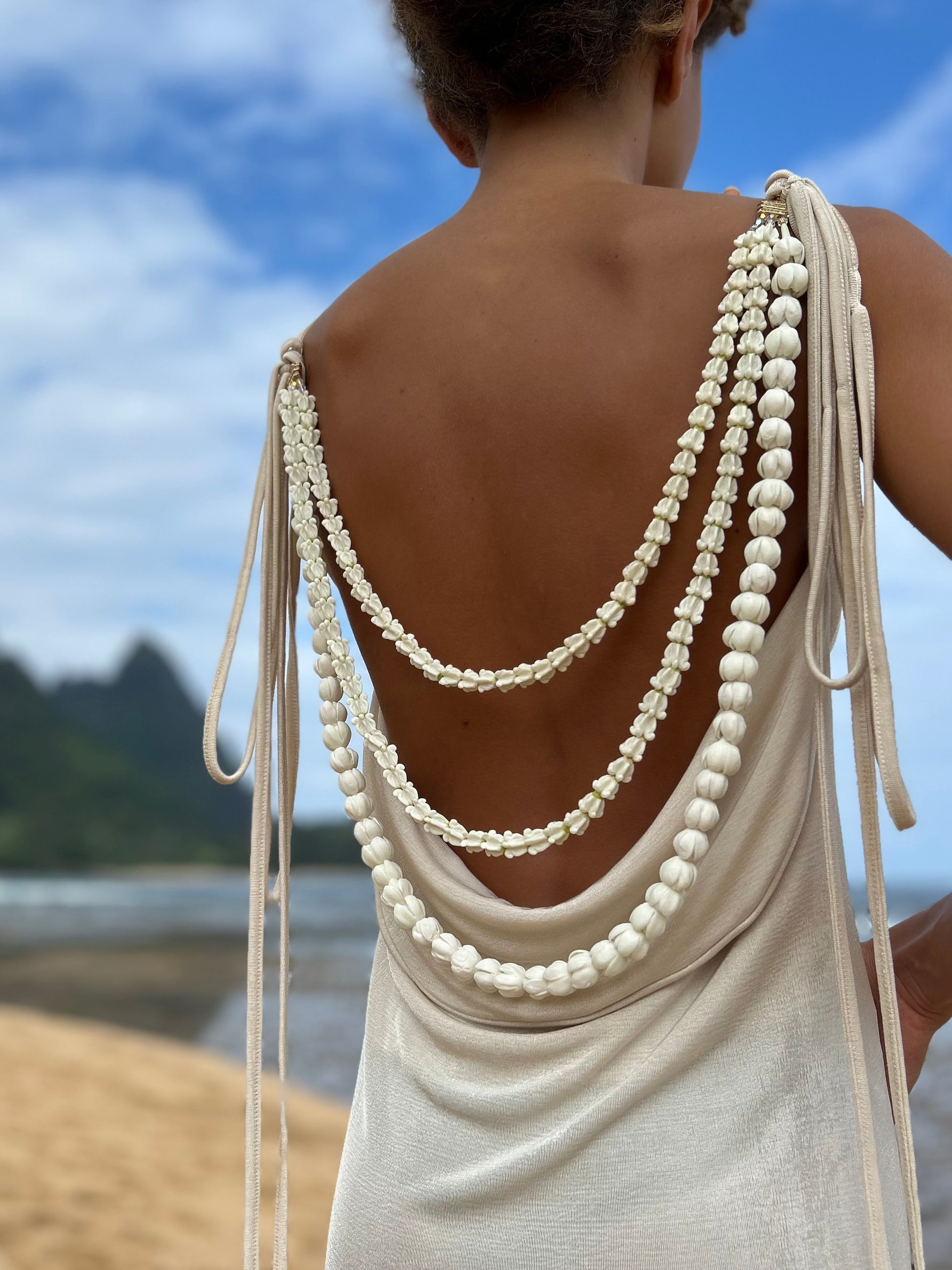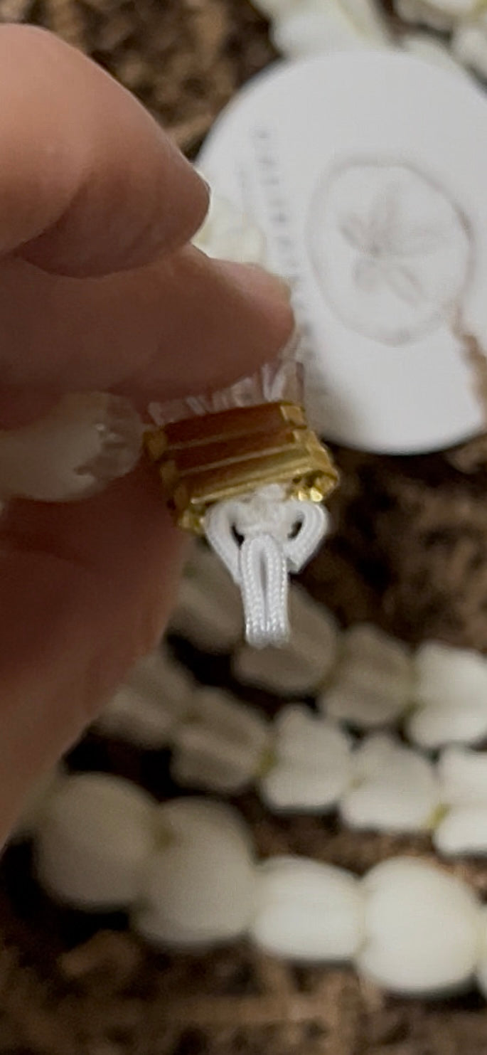 White crown and Pikake bud clay flowers drape across the back for a simple yet elegant modern bridal garment. The top of this piece is adorned with crystal and garnished beads that meet the brides gown for a secure fixture with hook and eye connection. Eye comes with lei and will need secured on the garment of your choice.